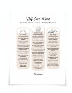 Click here to get your free printable Self Care Menu to help you brainstorm new ways to